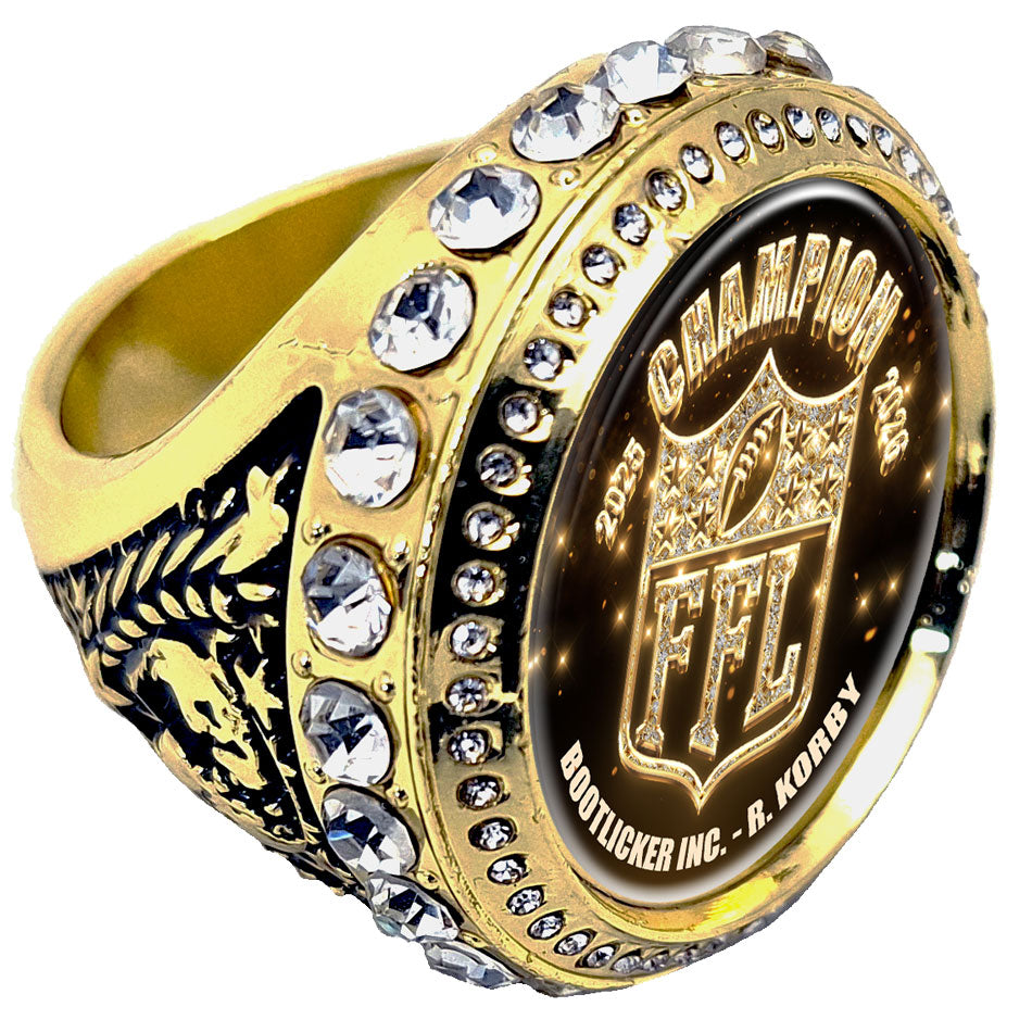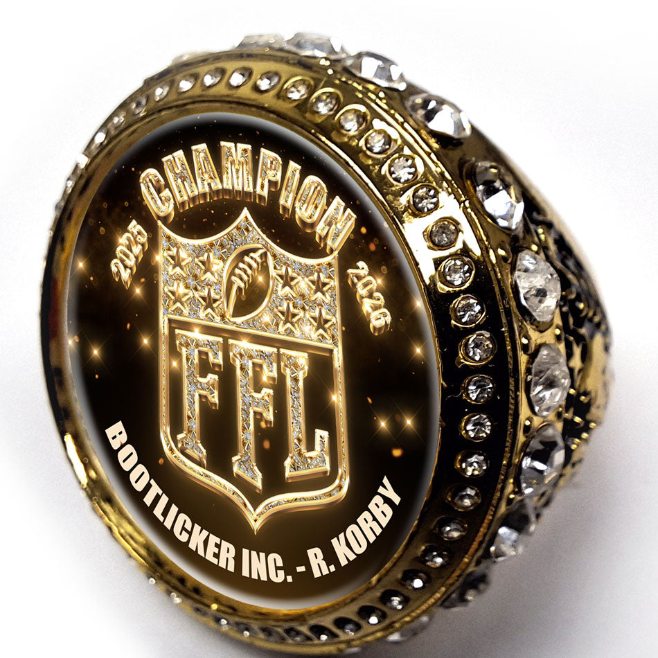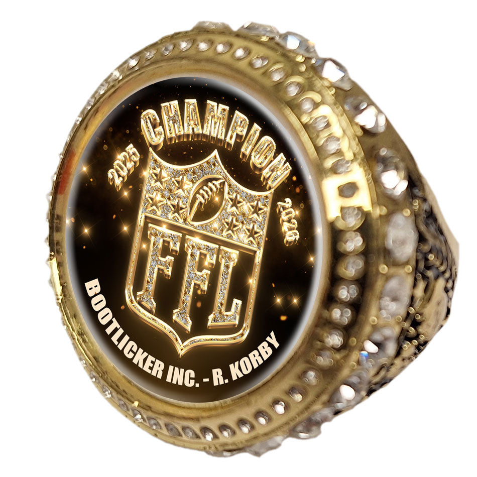 We are calling all champs! It's time to make a statement, a real personal statement. The Power Rings by TrophyKing.ca are not only big, heavy, and bulky, they're beautiful. Each ring is adorned by clear gemstones making you even more prominent. Available in bright gold. Each ring includes a bedazzled FFL graphic and year. Includes your name and or league name.